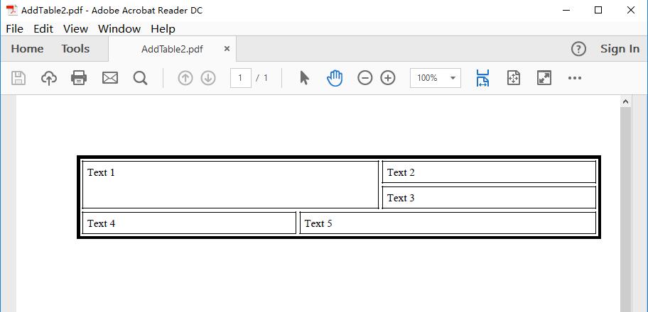 Table table = new Table(); //Set table border table.Margin = new System.Windows.Thickness(3); table.Borders = new TableBorders(new Border(3, RgbColors.Black)); table.BorderSpacing = 5; //Set cell border Border border = new Border(1, RgbColors.Black); table.DefaultCellState.Borders = new TableCellBorders(border, border, border, border); table.DefaultCellState.Padding = new System.Windows.Thickness(5); TableRow row = table.Rows.AddTableRow(); //Add a merged cell in 2x2 TableCell cell = row.Cells.AddTableCell(); cell.RowSpan = 2; cell.ColumnSpan = 2; cell.Blocks.AddBlock().InsertText("Text 1"); //Add a single cell cell = row.Cells.AddTableCell(); cell.Blocks.AddBlock().InsertText("Text 2"); row = table.Rows.AddTableRow(); //Add a single cell cell = row.Cells.AddTableCell(); cell.Blocks.AddBlock().InsertText("Text 3"); row = table.Rows.AddTableRow(); //Add a single cell cell = row.Cells.AddTableCell(); cell.Blocks.AddBlock().InsertText("Text 4"); //Add a merged cell in 1x2 cell = row.Cells.AddTableCell(); cell.ColumnSpan = 2; cell.Blocks.AddBlock().InsertText("Text 5"); return table;